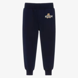 Navy blue joggers for boys and girls by Moschino, made in soft cotton jersey with ribbed trims. Casual and comfortable, they feature the luxury brand's Moschino Teddy Bear and logo for a distinctive look. The waist is elasticated for a snug fit and there are useful side seam pockets.