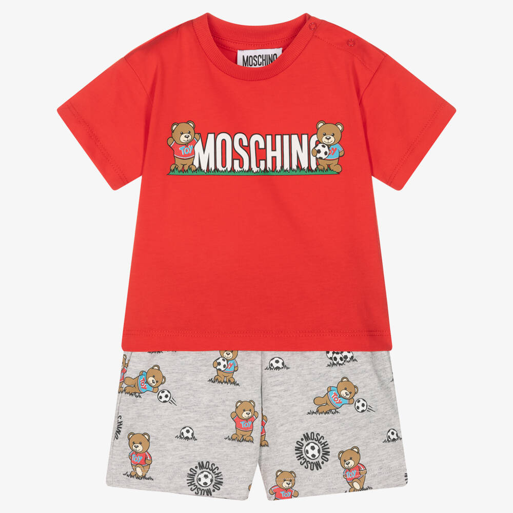 A red and grey shorts set for little boys, by luxury fashion house Moschino Baby. Easy-to-wear, the cotton jersey T-shirt has shoulder popper fastenings, while the shorts have a stretchy waistband and comfy pockets. For an instantly recognisable look, both items feature the brand's iconic Teddy Bear logo, having fun playing football.