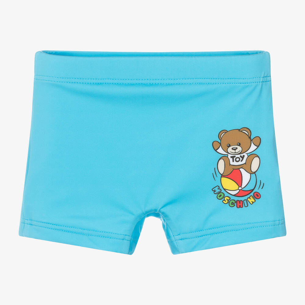 Cute turquoise blue swim shorts for little boys by Moschino Baby. Silky and stretchy, they have a stretchy waistband for comfort on little tummies. The brand's signature Moschino Teddy Bear character is pictured on one leg with a colourful beach ball.