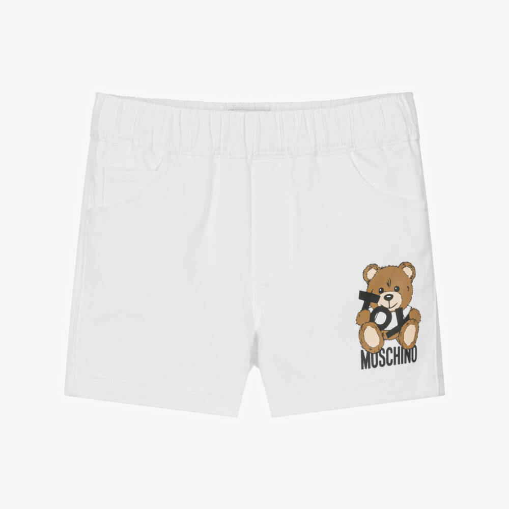 White shorts for little boys by Italian brand Moschino, with the designer's iconic Moschino Teddy Bear logo on the front. Made in smooth cotton twill with added stretch for comfort, they have a gently elasticated waist and four pockets.