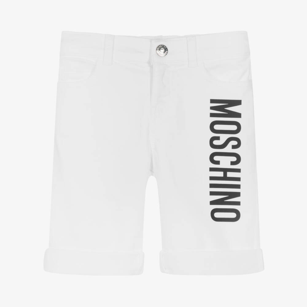 Boys white shorts by Moschino Kid-Teen, made in soft cotton twill. Great for smart casual looks, they have a bold black logo print on one leg for a recognisable look and a logo-embossed popper on the front for luxe designer details. They have stylish turned-up cuffs and an adjustable waist for a great fit.