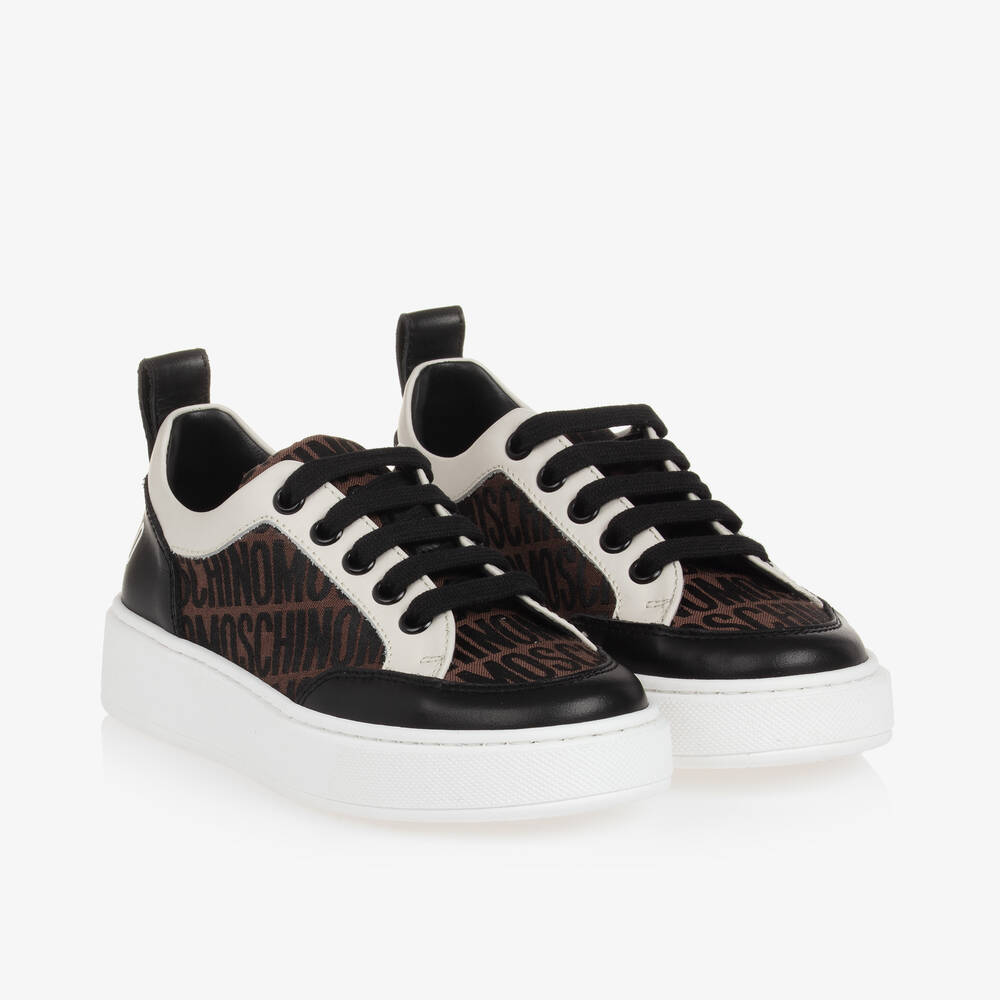 Brown lace-up trainers for boys and girls by Italian brand Moschino, both stylish and practical for active days. Trimmed with black leather, the textile uppers are woven with jacquard logo lettering and printed with white branding on the heel counter. They have a comfortable leather lining, a heel loop on the back and white, non-slip rubber soles for good grip.