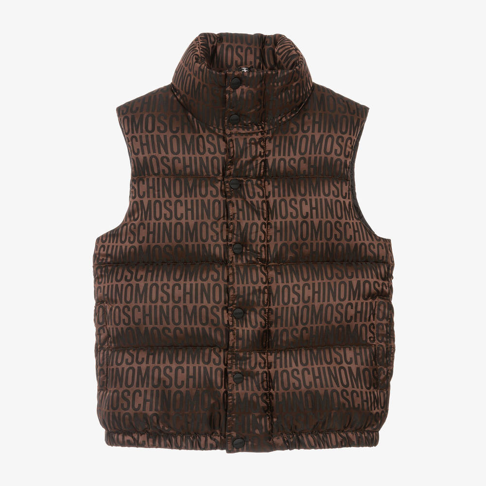Taken from the adult collection, this cool brown satin puffer gilet for boys and girls is by luxury brand Moschino Kid-Teen. Silky soft with warm padding, it has an eye-catching black jacquard logo pattern for an unmistakable look. A stylish layering piece, it has a high neck, two side pockets and a neat, elasticated hem. The chunky zip is concealed under a front placket for extra cosiness, with logo-embossed popper fastenings.