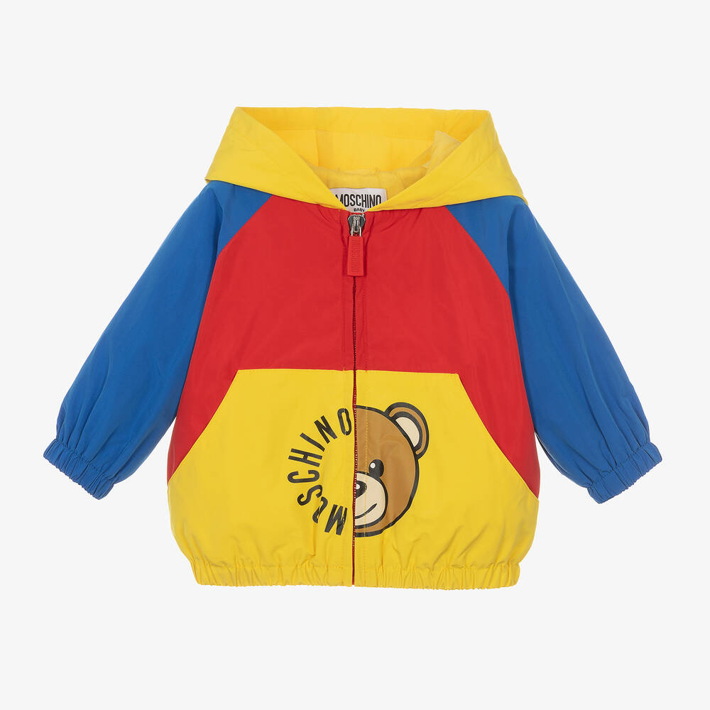 Bright colourblock jacket for little boys and girls by Moschino Baby in shades of blue, red and yellow. Silky smooth and lighweight, this colourful hooded jacket has a comfortable cotton jersey lining. It has ribbed trims, front patch pockets and a zip fastening with a red logo branded pull. For fun designer appeal, a black logo print is on one side of the zip and a playful Moschino Teddy Bear on the other.
