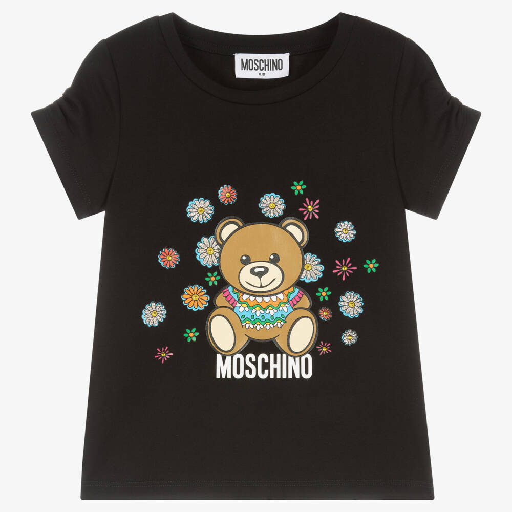 Black cotton T-shirt for girls by Moschino Kid-Teen, with a colourful Moschino Teddy Bear print and sparkling diamanté floral design. Made in lightweight stretch jersey for a comfortable wear. It has pretty ruched short sleeves for a girly look and a small rounded neckline.