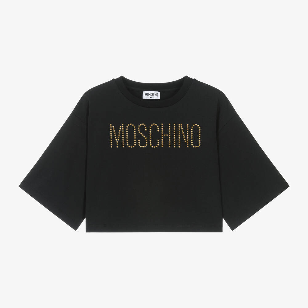 Stylish black T-shirt for girls from Moschino Kid-Teen, made in soft cotton jersey. In a relaxed boxy fit, this casual top has dropped shoulders and oversized short sleeves. The Italian designer's name features boldly on the front in gold heart-shaped studs, for instant brand recognition.