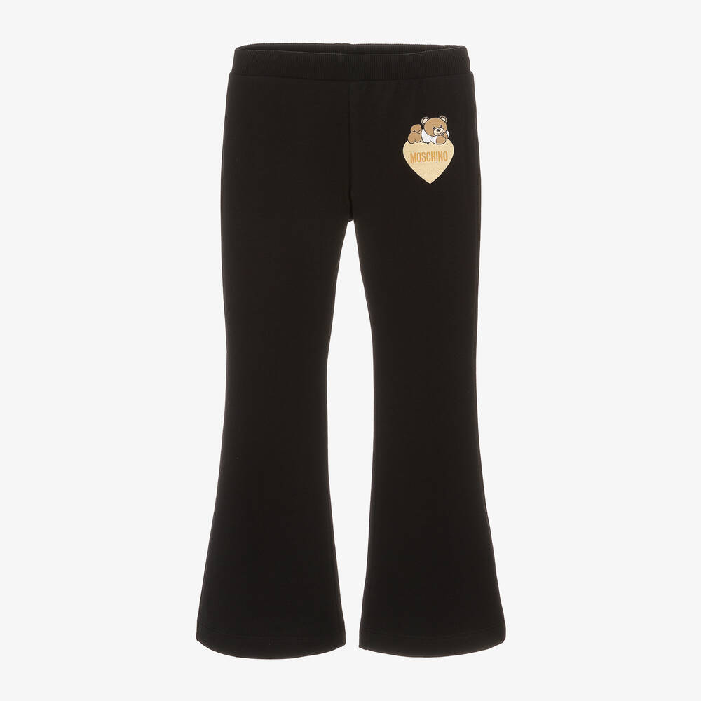 Black flared joggers for girls by Moschino Kid-Teen, made from soft mid-weight cotton jersey. Printed on one side is their iconic Moschino Teddy Bear logo lying on a metallic gold heart for a signature finish. Great for a casual style, they have a comfortable ribbed elasticated waist.