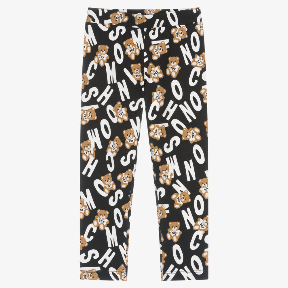 Black leggings for girls by Moschino Kid-Teen, made in soft, comfortable cotton jersey. Ideal for all-day relaxed wear, they are full length and have a bold, all-over white and beige Moschino Teddy Bear logo print.