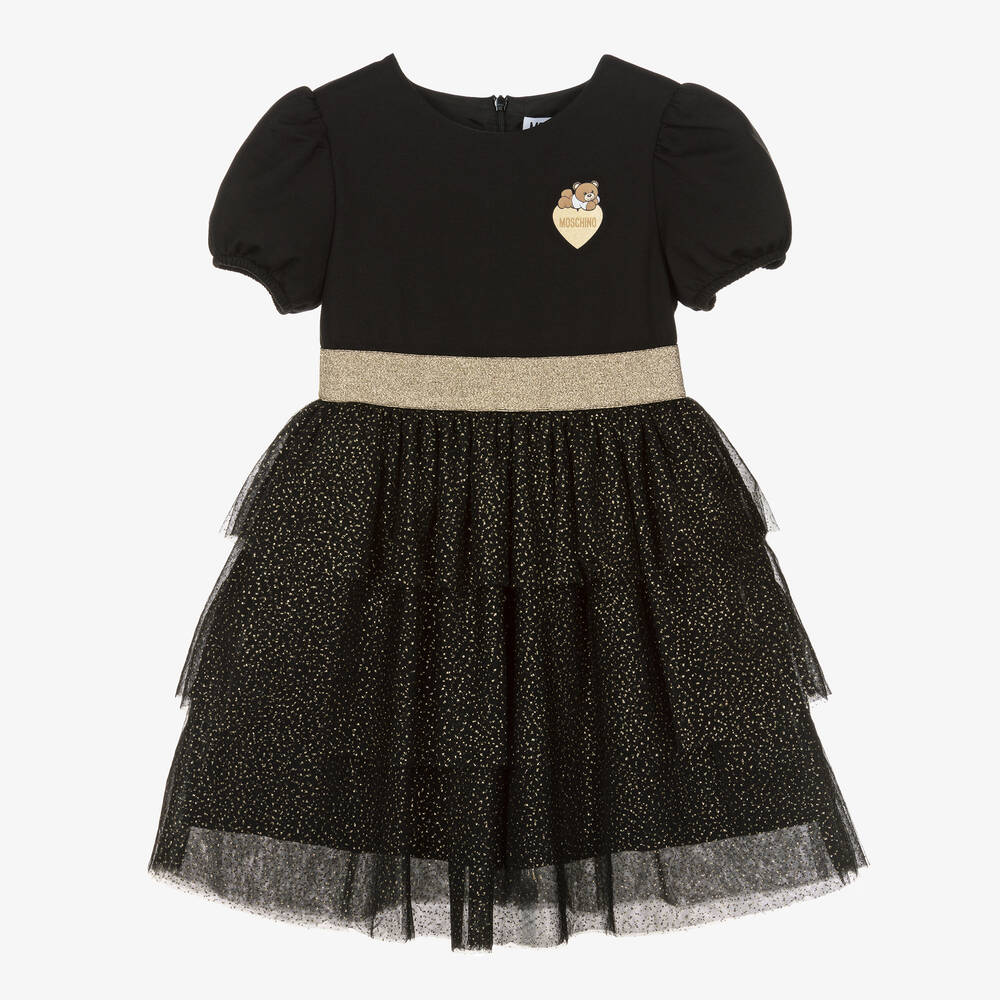 A gorgeous, special occasion black and gold dress for girls by Moschino Kid-Teen. The bodice is made in stretchy jersey, with a silky satin lining. It has pretty puffed sleeves and a cute Moschino Teddy Bear logo on the chest. The full skirt is made in tiered layers of gold-spotted tulle, with a gold lurex waistband for extra glamour. This eye-catching dress secures with a concealed zip fastening on the back.