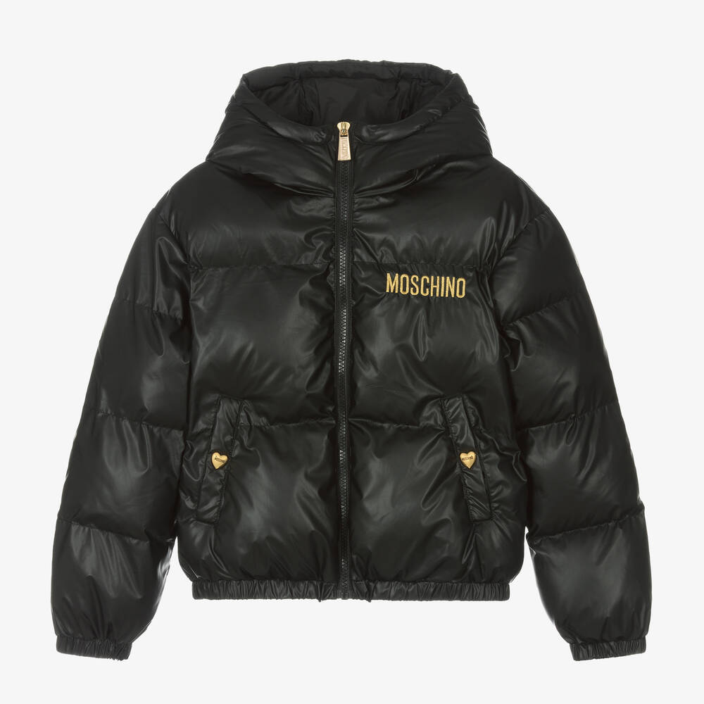 Stylish black hooded puffer jacket for girls by Moschino Kid-Teen, with an eye-catching gold logo embroidered on the chest. Silky smooth with mid-weight padding, it has a cosy hood and elasticated cuffs and hem to keep the cold out. The fleece-lined front pockets are secured with branded golden heart poppers. The front zip fastening has a logo-embossed puller, adding a finishing designer touch.