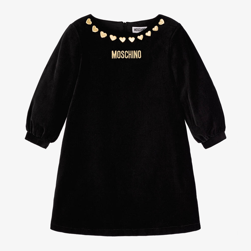 A chic black dress for girls by Moschino Kid-Teen, lovely for a special occasion. For instant designer recognition, gold logo embroidery can be seen on the front, with matching hearts around the neckline. Beautifully comfortable, it is made in luxuriously soft velvet with a lightweight satin lining. It is designed in a stylish A-line shape, with gently gathered cuffs on the long sleeves and a concealed zip fastening on the back.