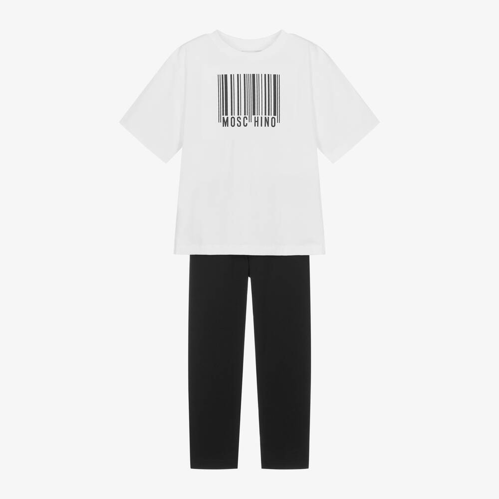 Inspired by the adult collection, this casual cotton jersey leggings set for girls is by Moschino Kid-Teen. Oversized for a relaxed look, the white crew neck T-shirt features a cool barcode and logo graphic printed on the front. The black full length leggings have a comfortable elasticated waist, with a white logo print for a signature finish.