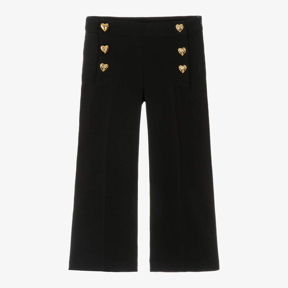 Stylish black wide-leg trousers for girls by luxury Italian brand Moschino Kid-Teen. They are made in soft and flowy crêpe with added stretch for comfortable wear. Two rows of decorative golden heart logo buttons add a glamourous touch to the smart casual tailoring. There is an adjustable waist and a concealed zip fastens seamlessly on one side.