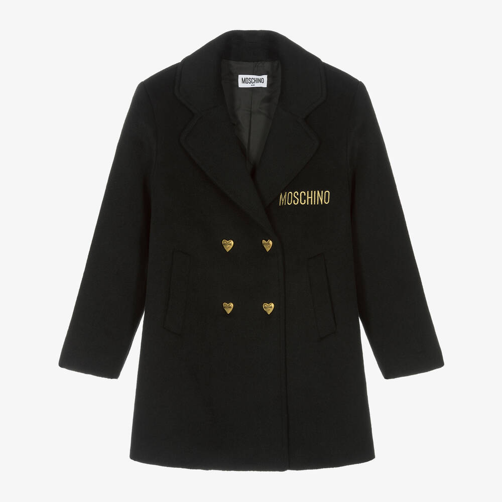 Inspired by the main collection, this smart black coat for girls is by luxury Italian brand Moschino Kid-Teen. With bold, gold logo embroidery on the chest, it is made in a mid-weight wool blend with a soft, felted feel. It has a traditional, double-breasted style and fastens with shiny gold, heart-shaped poppers that are branded for a signature finish. It has useful pockets on the front and is fully lined for comfort.