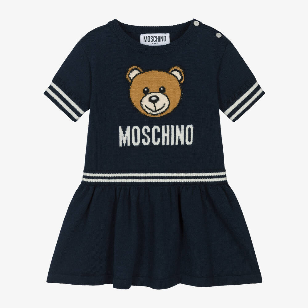 Navy blue with ivory striped trims, this lovely knitted dress for little girls is by luxury Italian brand Moschino Baby. It is made in a soft cotton and wool blend, with shoulder button fastenings to assist with pulling over the head. Instantly recognisable, the designer's iconic Moschino Teddy Bear can be seen on the front.
