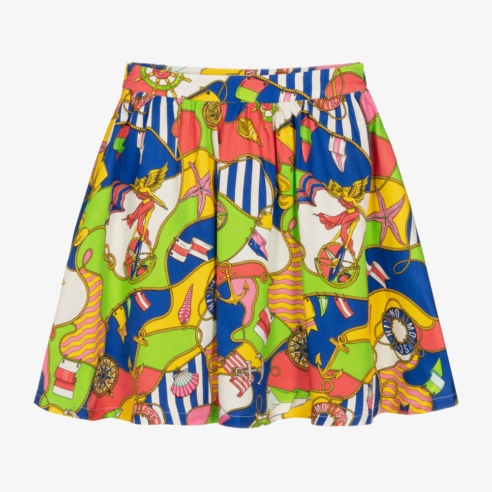 Vibrant and colourful Mini-me skirt for girls by Moschino Kid-Teen, with an abstract nautical-themed logo pattern. Made in silky viscose twill for a luxurious feel, this gathered style fastens with a concealed zip on the side.