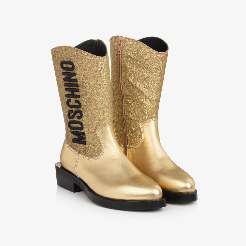 Beautifully sparkly, these gold cowboy boots for girls by Italian label Moschino, are made in smooth leather with glittery gold panels. Making an instant designer statement, these stylish boots have bold black logo lettering on one side. They are lined in soft leather with classic detailing and shaping, and a side zip fastening. The smooth, rubberised outer sole has a small heel to complete the look.