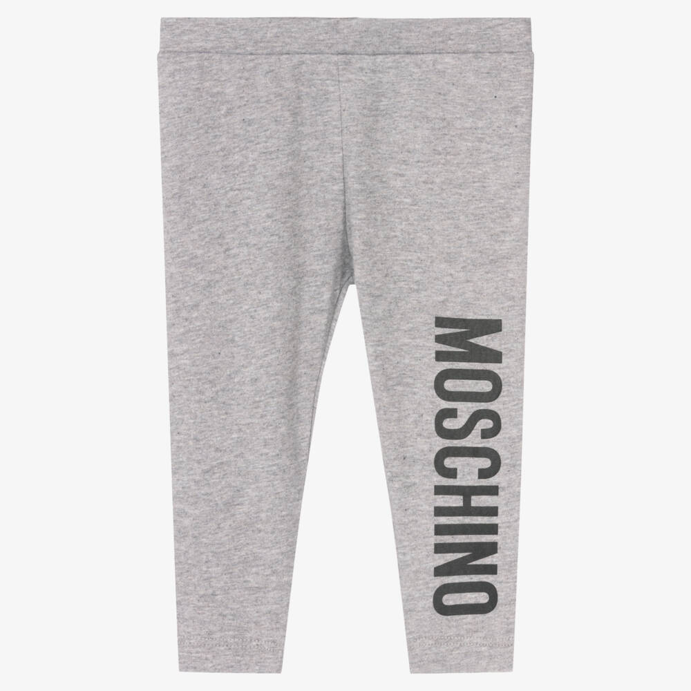 Grey cotton leggings for little girls by Moschino Baby. There is a black logo print down one leg and they have a gently elasticated waistband. They are made in soft cotton jersey for cool and comfortable wear.