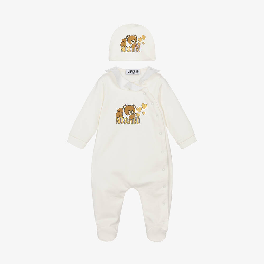 Ivory babygrow and hat set for girls by Moschino Baby, made in soft cotton jersey. Cosy and comfortable, the babygrow has a warm, fleecy inside. It has a pretty ruffle collar and popper fastenings on the front. The brand's iconic Moschino Teddy Bear is printed on the chest in gold and white, with glittery gold hearts. The cute double layer hat has a matching logo on the front.