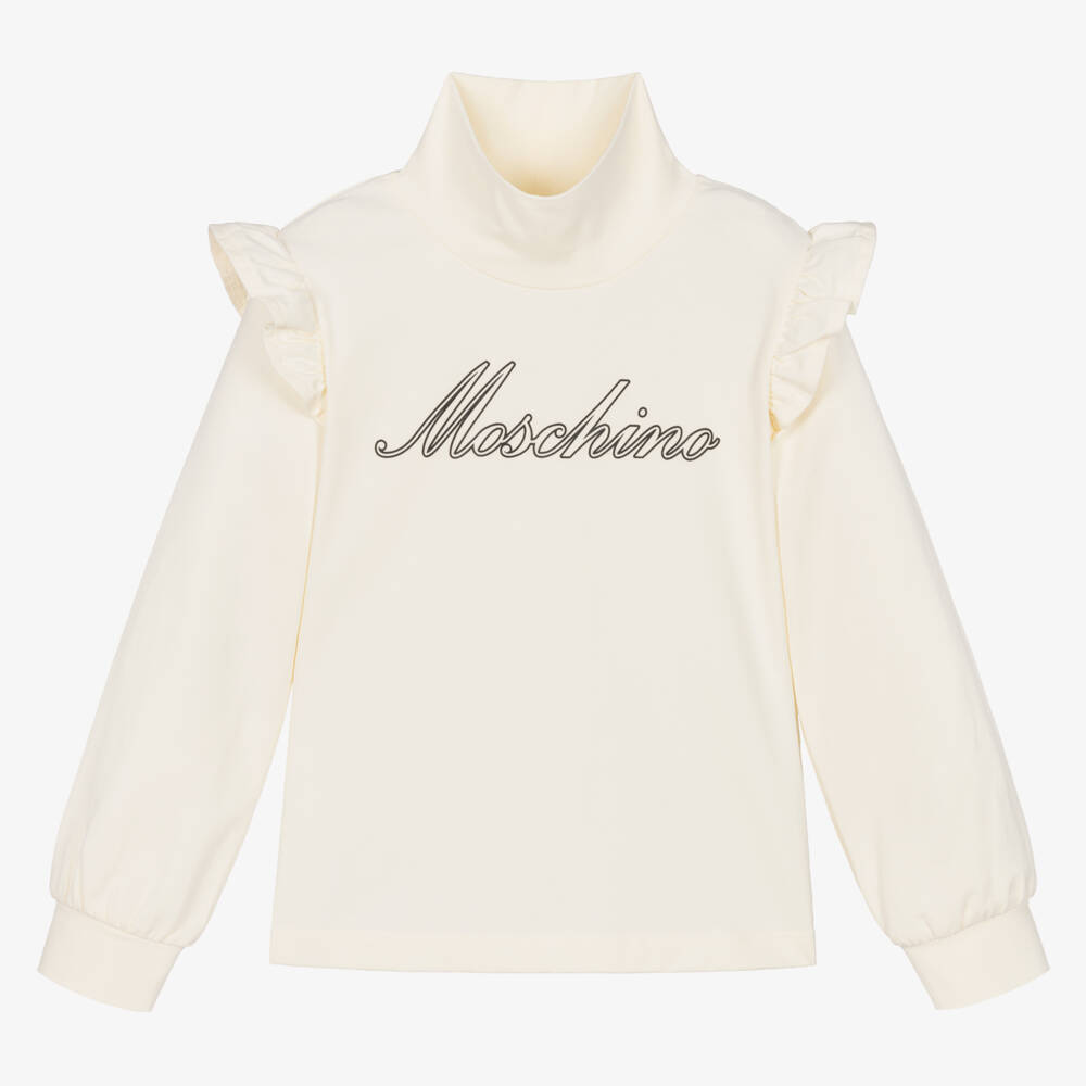 From Italian designer Moschino Kid-Teen, this ivory long-sleeved top for girls has a raised black logo print across the front. Made in luxuriously soft and comfortable cotton jersey, it is styled with a high neck, cuffed sleeves and feminine ruffle trims on the shoulders.