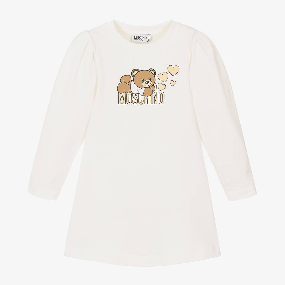 Casually styled, this ivory sweatshirt dress for girls is by Moschino Kid-Teen. Made from soft mid-weight cotton jersey, it is printed with an iconic Moschino Teddy Bear logo with metallic gold detailing and hearts for a fun branded look. Comfortable to wear, it has puffed long sleeves, side seam pockets, and a stretchy ribbed round neckline.