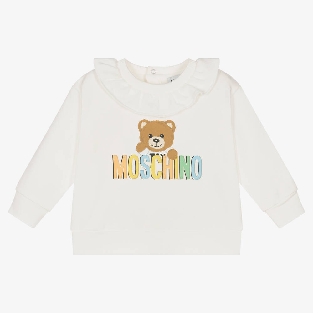 Lightweight ivory sweatshirt for little girls by Italian brand Moschino Baby, made in the softest cotton jersey. Brilliant and bold, it has the brand's instantly recognisable Teddy Bear printed on the front with a colourful logo design, and a pretty ruffled collar. There are useful popper fastenings on the back.