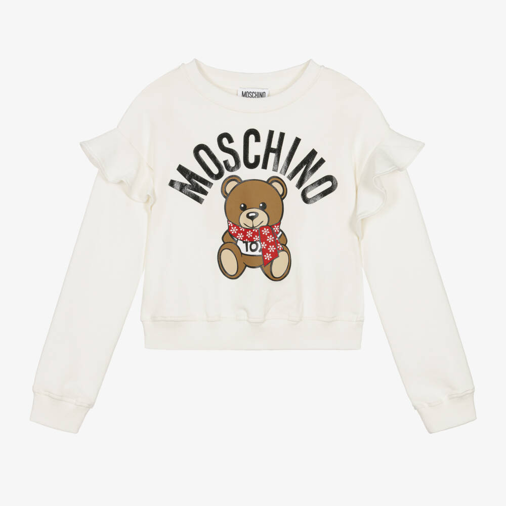 Ivory cotton sweatshirt for girls by Italian designer Moschino Kid-Teen. It has a bold, shiny black logo print across the front, together with the brand's instantly recognisable Teddy Bear dressed in a festive red scarf. Made in comfortable mid-weight jersey with a cosy fleece feel inside, it is slightly cropped to sit on the waist and has a relaxed fit with ruffle-trimmed dropped shoulders for a feminine touch.
