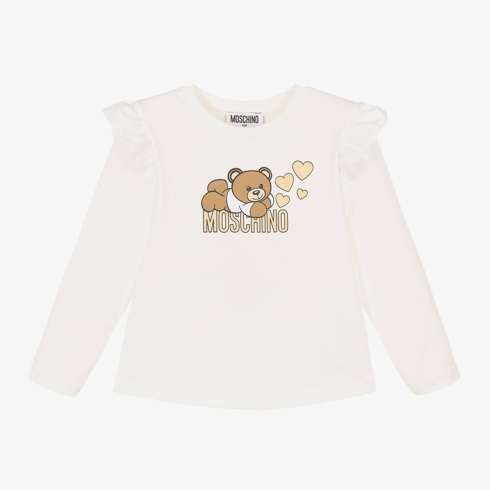 A lovely ivory long-sleeved top for girls by Moschino Kid-Teen, made from soft cotton jersey. Printed on the front is an iconic Moschino Teddy Bear logo with metallic gold detailing and hearts for a sweet branded look. Completing this casual style, it has pretty frilled trims over the shoulder and a stretchy ribbed round neckline.