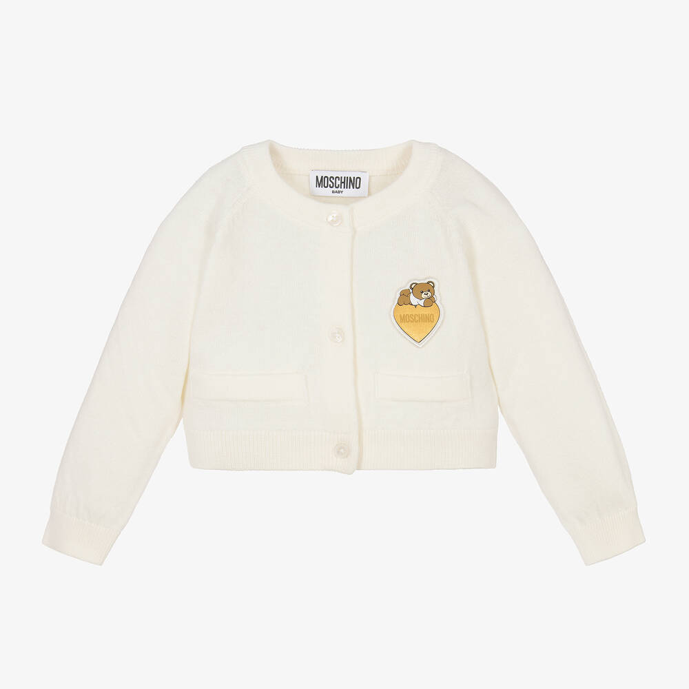 Lovely ivory cardigan for little girls by Moschino Baby, knitted in a super soft blend of cotton and wool. This cosy cardigan has raglan sleeves, button fastenings and faux pockets on the front. There is a padded appliqué on the chest, featuring a cute Moschino Teddy Bear on a golden heart.