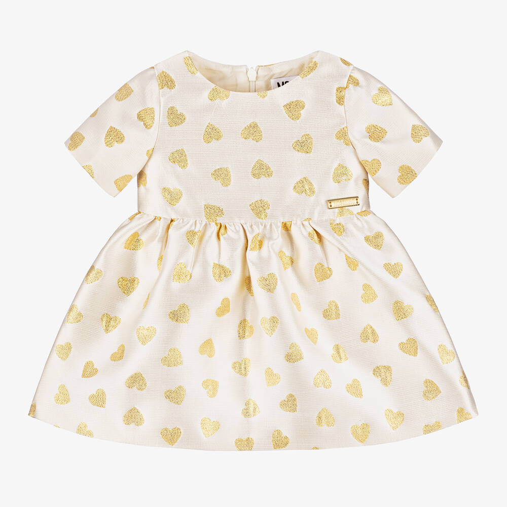 A delightful ivory dress for younger girls by Moschino Baby. Lovely for a special occasion, it is made in shimmery, slightly textured satin with a sparkling gold heart jacquard pattern. A small gold-tone logo plate trims the waist and for a neat finish, it fastens with a concealed zip on the back. It has a silky lining for comfort.