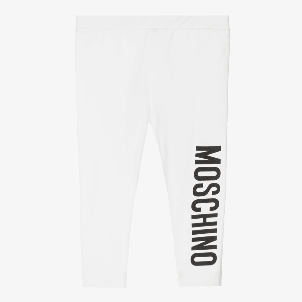 Ivory cotton leggings for little girls by Moschino Baby. There is a black logo print down one leg and they have a gently elasticated waistband. They are made in soft cotton jersey for cool and comfortable wear