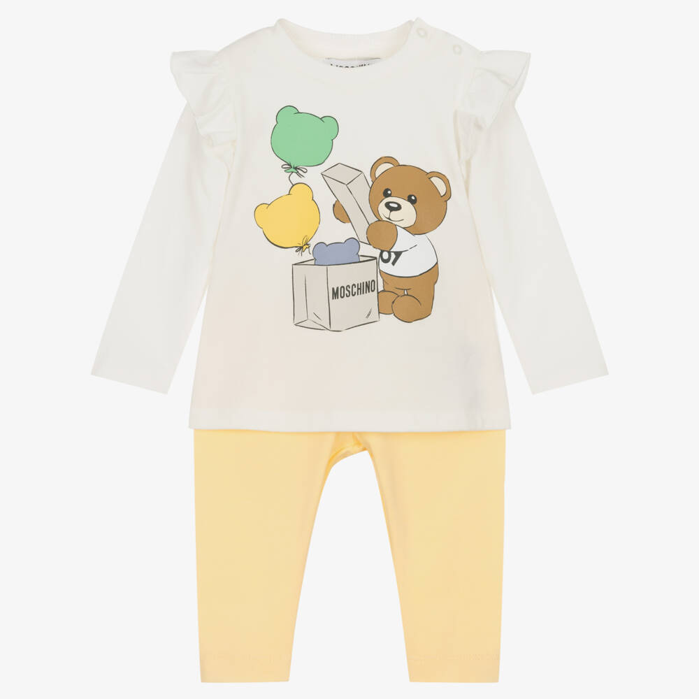 Cute ivory and yellow leggings set for little girls by Moschino Baby, made in soft and stretchy cotton jersey. The long-sleeved top has a Moschino Teddy Bear printed on the front, releasing colourful Teddy Bear shaped balloons from a box. Cosy with a brushed feel inside, it has sweet ruffles over the shoulders and useful popper fastenings on one shoulder. The yellow leggings have a matching print and a comfortable elasticated waistband.