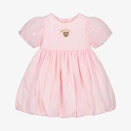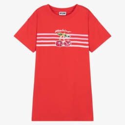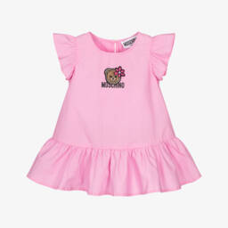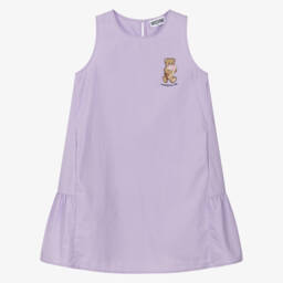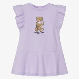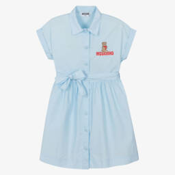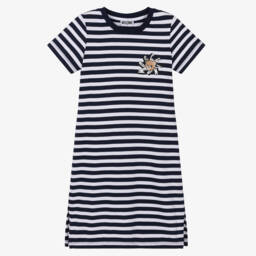 Ideal for relaxed days, a casual, comfortable cotton dress for girls by luxury Italian brand Moschino. With the look of a two piece, the navy blue jersey 'sweatshirt' has the iconic Teddy Bear printed atop a colourful logo, whilst the flared poplin skirt is striped in pale blue and white. Easy to wear, it simply pulls on.