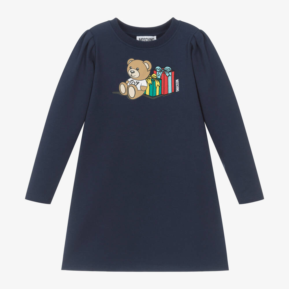 Navy blue sweatshirt dress for girls by Moschino Kid-Teen, made from soft cotton jersey. Lovely for the festive season, the brand's iconic Moschino Teddy Bear is printed on the front, relaxing against a colourful, embroidered gift appliqué. Comfortably styled in a gentle A-line shape, it has pleated, puffed sleeves and simply pulls on over the head.