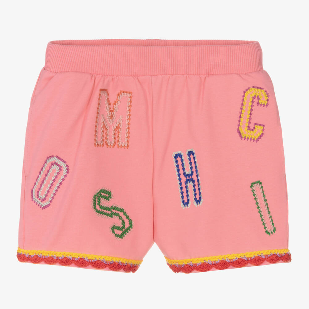 Mini-me pink shorts for girls by Moschino Kid-Teen, made in soft cotton jersey. Instantly recognisable, these fun shorts have colourful embroidered logo letters on the front and back and a sweet crochet trim on the hem for a summery look. The ribbed waistband is elasticated for casual comfort and there are concealed side seam pockets.
