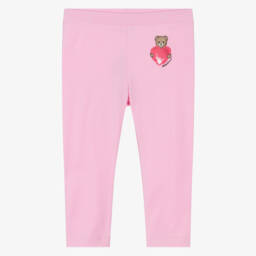 Mid pink leggings for girls by Moschino, made in soft and stretchy cotton jersey. These full-length leggings have a Moschino Teddy Bear logo on the front in pink, encircled by pretty, colourful flowers. They have a stretchy waistband for comfortable wear.
