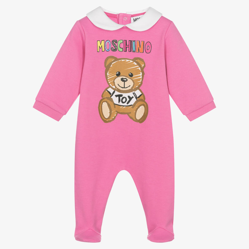Bright pink babygrow for girls by Moschino Baby, made in mid-weight textured cotton jersey. It has a colourful sketch-effect Moschino Teddy Bear logo print on the front and a white rounded collar. There are popper fastenings on the back for easy dressing.