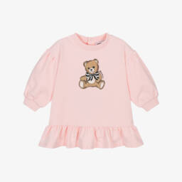 Pale pink cotton jersey dress for little girls by Moschino. This sweet style has the recognisable Moschino Teddy Bear printed on the front, holding a pink sequinned heart for added sparkle. It has cute puffed sleeves and poppers on one shoulder to help with dressing.