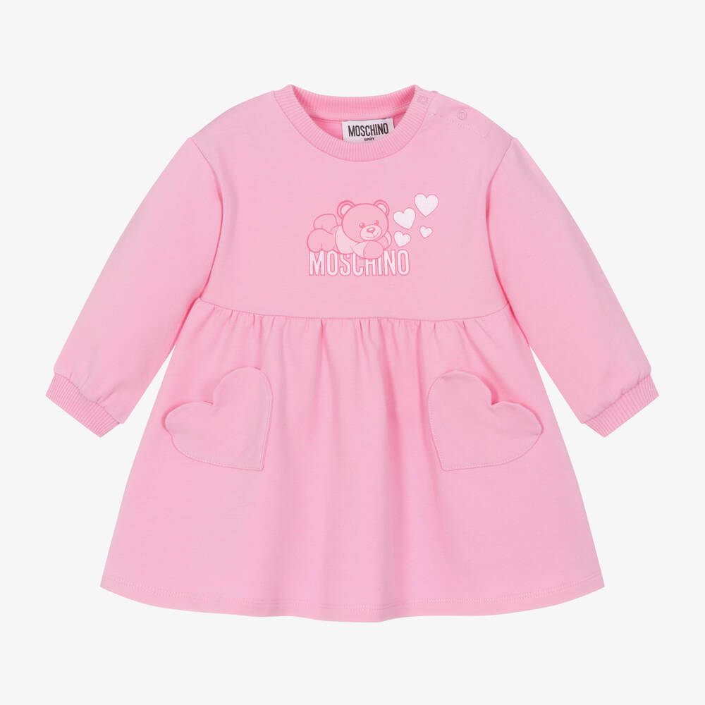 Bright lilac pink dress for little girls by Moschino baby, made in soft, mid-weight cotton jersey with a warm, fleecy inside. Cosy and comfortable to wear, this cute dress has ribbed trims and long sleeves. There are sweet heart-shaped patch pockets on the front and a pink Moschino Teddy Bear printed on the chest with glittery hearts. There are useful poppers on one shoulder to help with dressing.