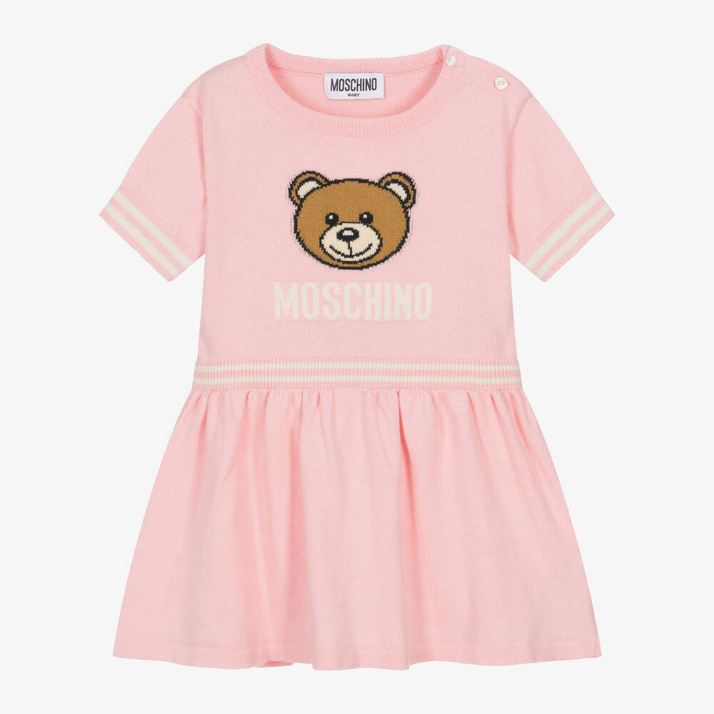 Pink with ivory striped trims, this lovely knitted dress for little girls is by luxury Italian brand Moschino Baby. It is made in a soft cotton and wool blend, with shoulder button fastenings to assist with pulling over the head. Instantly recognisable, the designer's iconic Moschino Teddy Bear can be seen on the front.