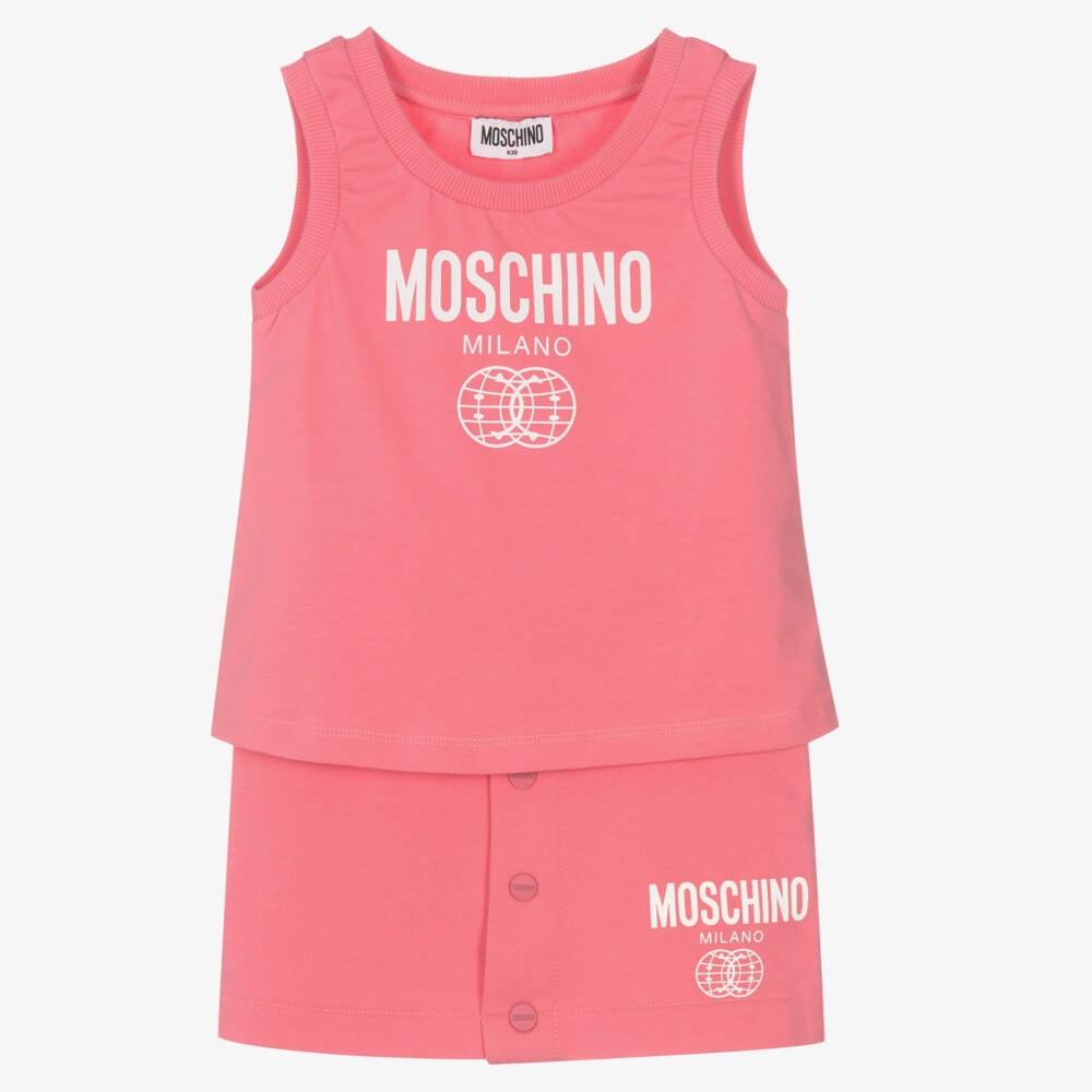 Mini-me pink vest and skirt set for girls by Moschino Kid-Teen, made in soft cotton jersey. For instantly recognisable style, the vest top has a white Double Smiley logo print on the front and casual ribbed trims. The matching skirt has decorative, branded buttons on the front and a stretchy waistband for comfortable wear.