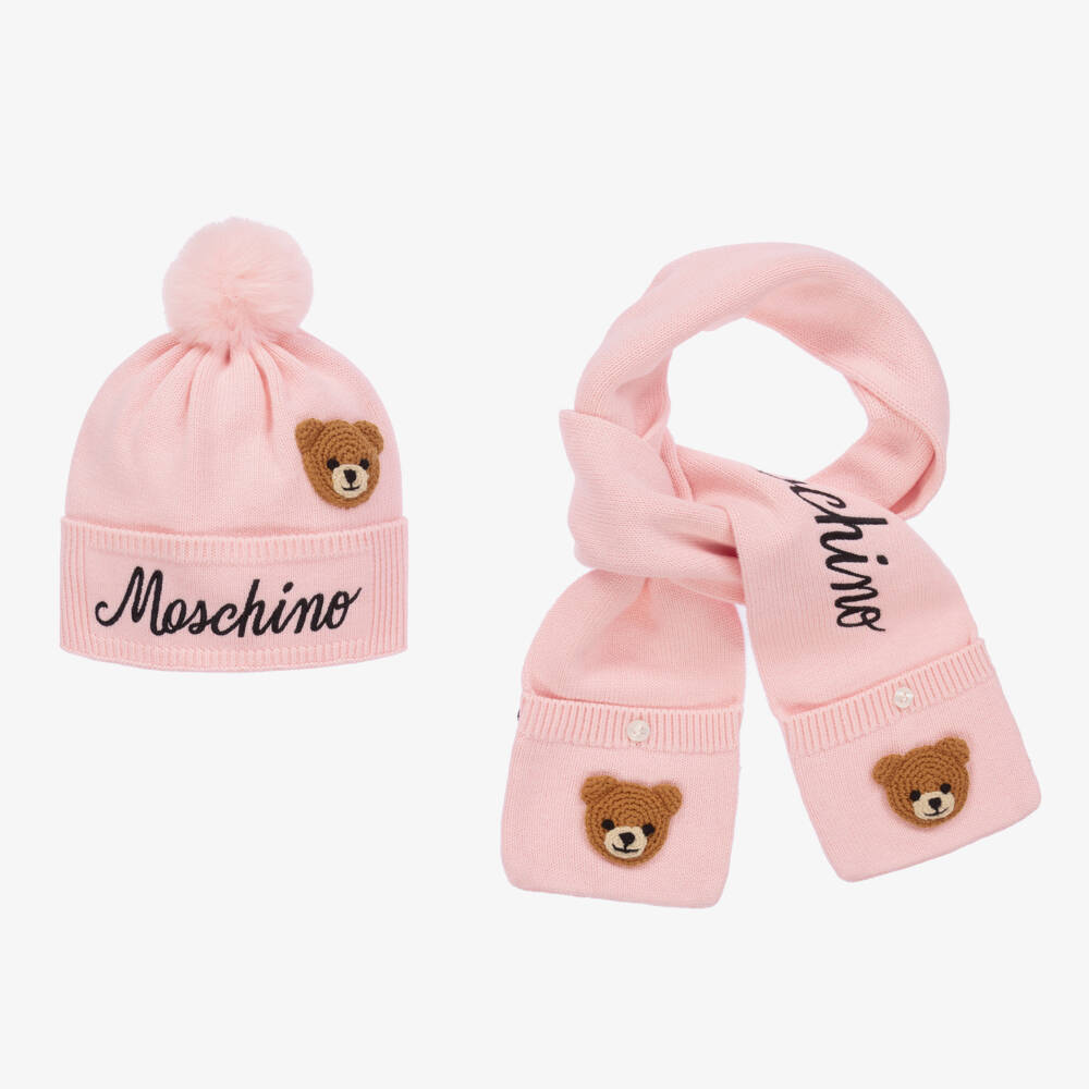 Adorable light pink hat and scarf set for girls by luxury Italian brand, Moschino Kid-Teen, presented in a lovely gift box. Made in a mid-weight cotton and wool blend knit, both have matching black logo embroidery and cute knitted brown teddy bear appliqués for a coordinated look. The beanie hat has a super soft pom-pom on the top and a wide turned-up brim. The lovely double layer scarf has buttoned pockets on both ends to keep little hands warm and cosy.