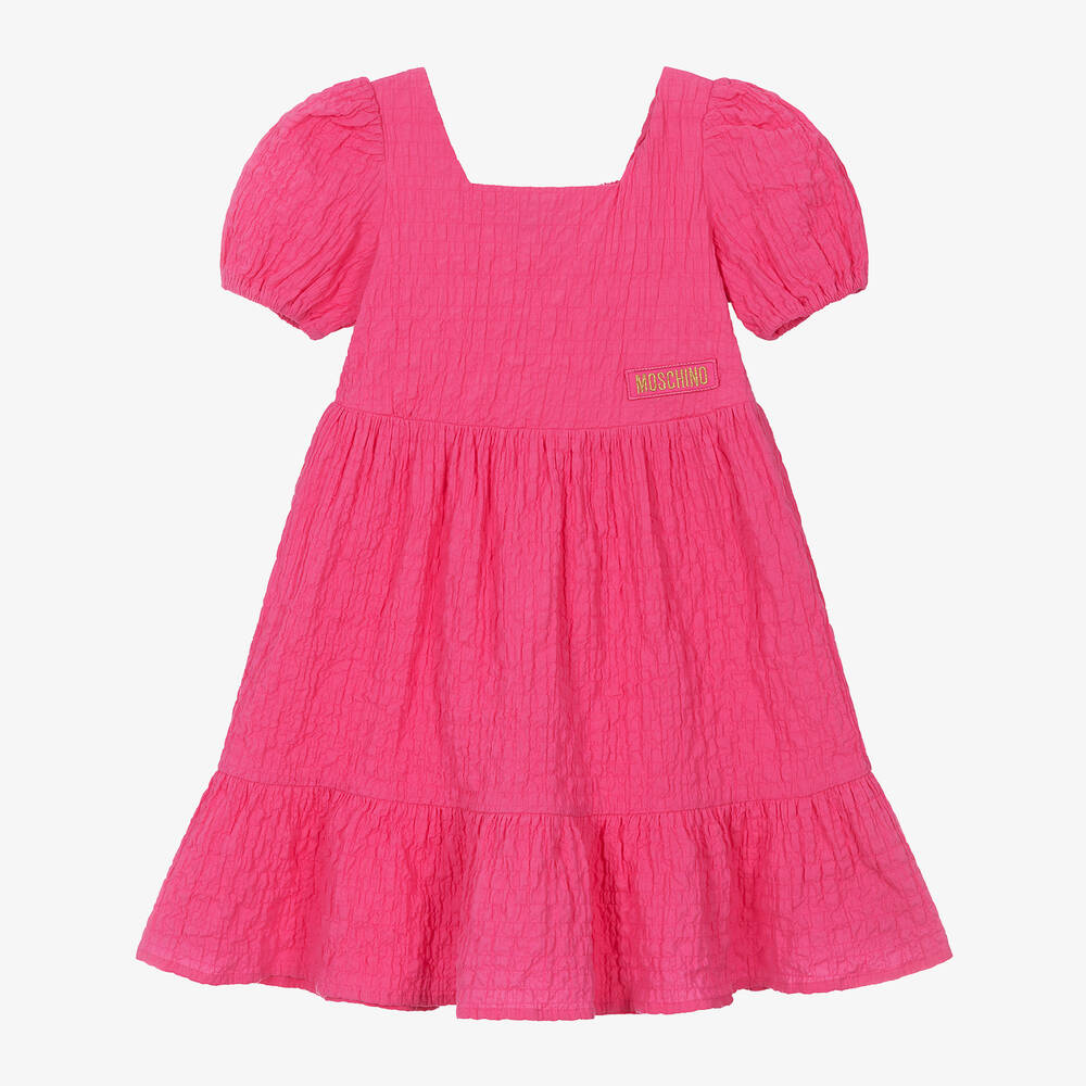 A lovely bright pink cotton dress for girls by luxury Italian fashion house Moschino Kid-Teen. For added designer appeal, a glittery gold logo tab is stitched onto the bodice. This feminine dress has a square neckline, pretty puffed sleeves and a frilled hemline. Made from shirred seersucker to create a crinkled look, it is lightweight and comfortable, and has a concealed zip fastening on the side.