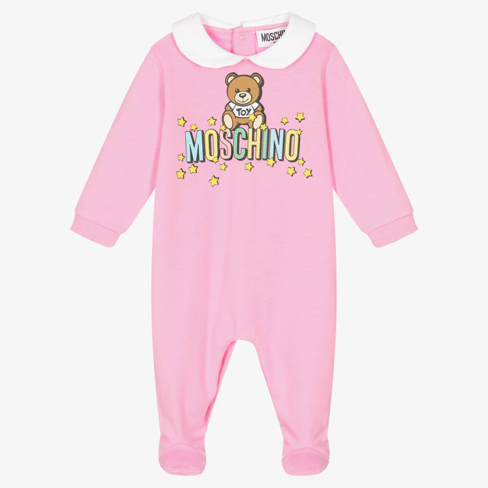 A lovely pink babygrow for girls, by luxury Italian brand Moschino Baby. Instantly recognisable, it features the brand's iconic Moschino Teddy Bear design, with a colourful logo and stars printed on the front. This item is presented in a gift box, and has a cute Peter Pan collar. It is made in the softest organic cotton jersey with a looped underside, and has popper fastenings on the back.