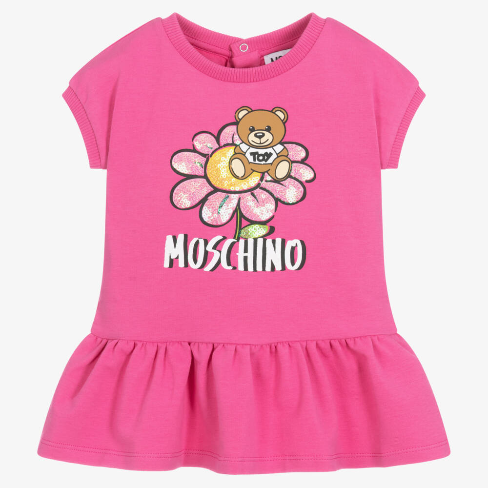 Fuchsia pink sweatshirt dress for little girls by Italian brand Moschino Baby, made in a soft, comfortable cotton jersey. It has the brand's iconic Moschino Teddy Bear logo printed on the front, with an iridescent sequined flower. There are useful popper fastenings on the back.