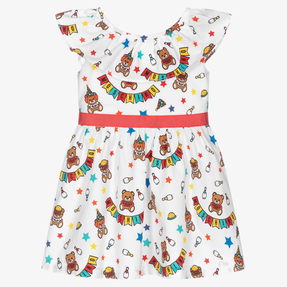 White dress for little girls by Moschino Baby, made in soft and lightweight cotton poplin. Fastening with a zip on the back, it has a lovely ruffle neckline trim and a red waistline. It is patterned in a bright and colourful circus-themed Teddy Bear logo print.