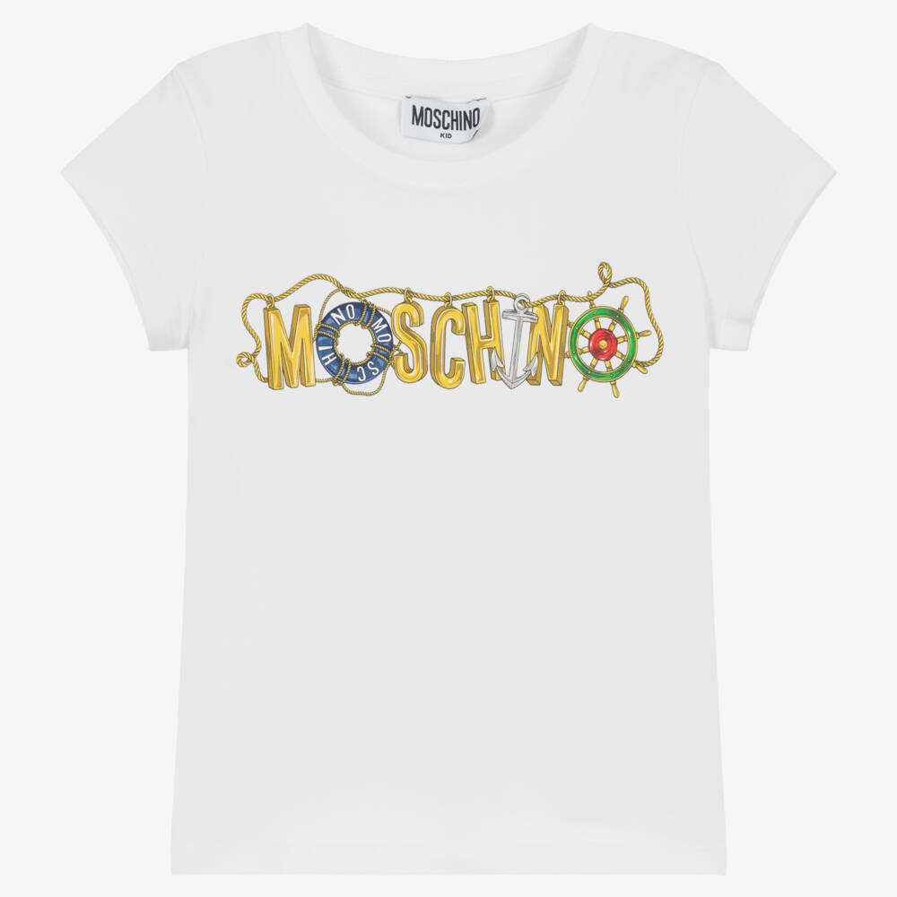 A great addition to her casual wardrobe, this white cotton T-shirt for girls is by Italian brand Moschino Kid-Teen. Inspired by the adult collection, it has a stunning nautical themed logo on the front in gold, blue, red and green. Made in soft jersey, it has a ribbed neckline and capped sleeves.