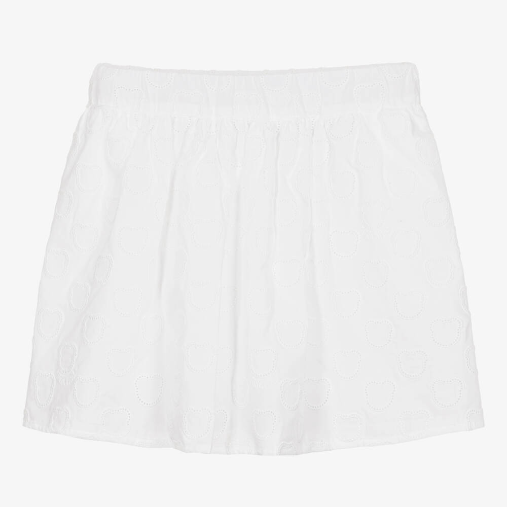 A pretty white skirt for girls by luxury Italian brand Moschino Kid-Teen. It is embroidered with the iconic Moschino Teddy Bear logo all-over for a discreet designer look. Made in soft and lightweight cotton, this breathable skirt is fully lined with an elasticated waistband.
