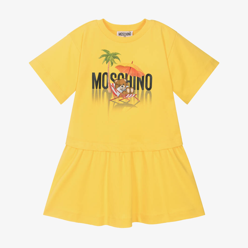 Bright yellow dress for girls by Moschino, made in soft cotton jersey. This casual piece features a fun motif of the instantly recognisable Moschino Teddy Bear relaxing beneath a palm tree. It is designed in a cool and comfortable T-shirt style, with a ribbed neckline and dropped waist.