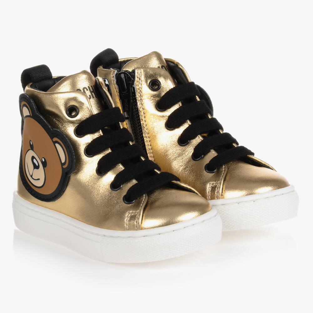 Playful gold leather trainers for boys and girls by Moschino Kid-Teen. The uppers have the brand's famous Moschino Teddy Bear logo appliqué on one side, with black logo lettering on the tongue. Fastening with laces and a side zip, these shoes also have a lopped tab on the heel for ease. They are finished with a soft leather insole and non-slip rubber sole.